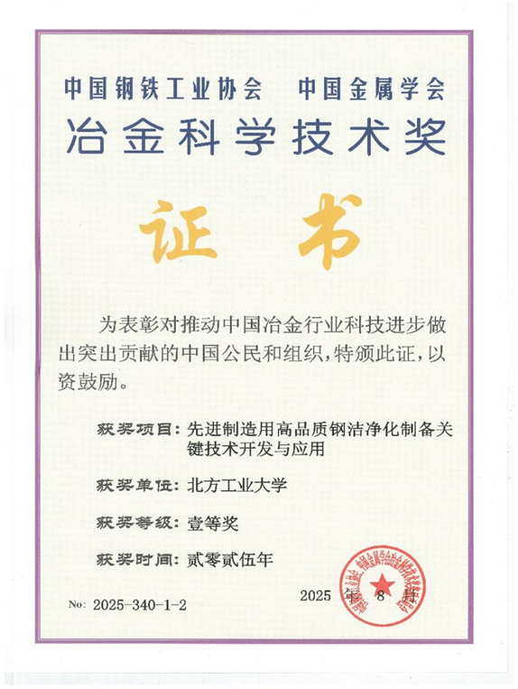 近日,冶金科学技术奖奖励委员会正式公布了2025年度中国钢铁工业协会与中国金属学会联合颁发的冶金科学技术奖获奖名单。在此次评选中,张立峰校长团队的科研成果——“先进制造用高品质钢洁净化制备关键技术开发与应用”荣获一等奖。张立峰校长为该项成果的第一完成人,我校为第二完成单位,其他参与单位还有北京科技大学、首钢集团有限公司、江阴兴澄特种钢铁有限公司、中国第一重型机械股份公司、邯郸钢铁集团有限责任公司、石家庄钢铁有限责任公司、上海梅山钢铁股份有限公司、南京钢铁股份有限公司、唐山钢铁集团有限责任公司。