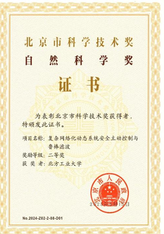 由我校作为第一完成单位,庞中华教授为第一完成人的项目“复杂网络化动态系统安全主动控制与鲁棒滤波”,获得“自然科学奖”二等奖。姚海波教授参与完成的项目“小净距超大跨隧道建造关键技术及应用”,获得“科学技术进步奖”二等奖。胡长斌教授参与完成的项目“保障超大城市用电安全的需求侧资源灵活调节关键技术及工程应用”,获得“科学技术进步奖”二等奖。